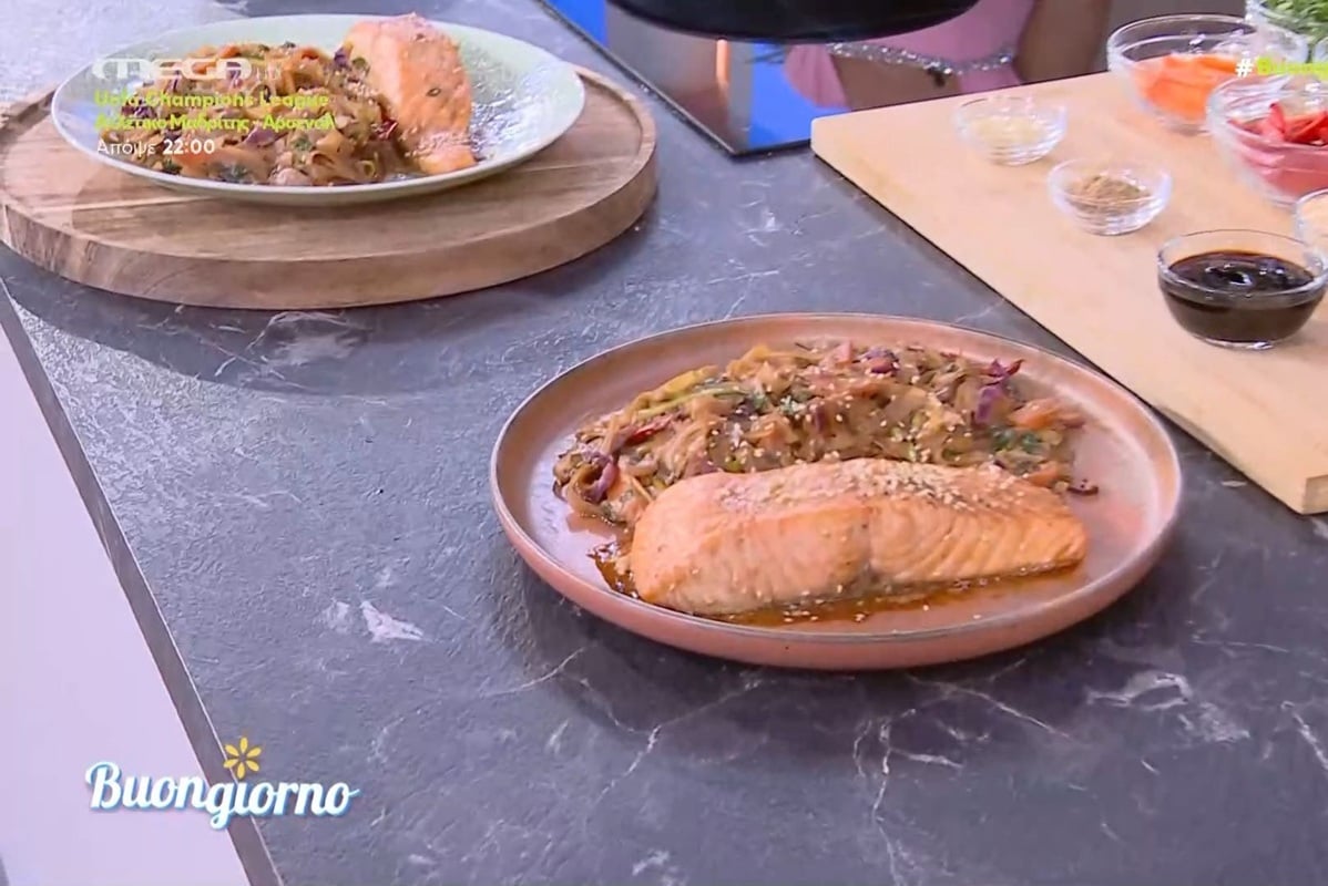 Ο Δημήτρης Σκαρμούτσος έφτιαξε στην κουζίνα της εκπομπής «Buongiorno» το πρωί της Τετάρτης σολομό με λαχανικά και noodles ρυζιού.