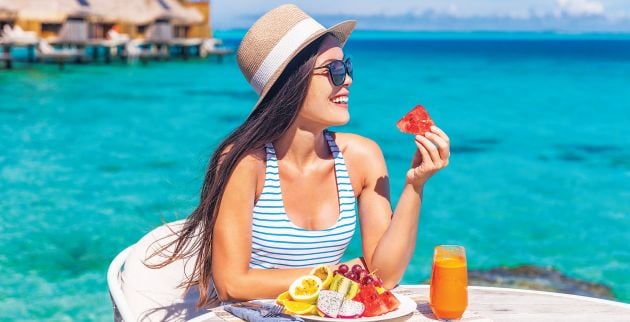 Προσπαθούμε να καταναλώνουμε φρούτα και λαχανικά, που είναι πλούσια σε φυτικές ίνες, βιταμίνες και μεταλλικά στοιχεία. Τα καταναλώνουμε ως σνακ στην παραλία είτε σε μορφή φρέσκου χυμού.