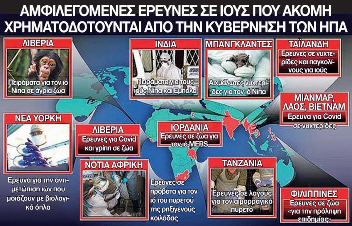 Το δημοσίευμα επισημαίνει ότι η «Daily Mail» έχει αποκαλύψει πως με χρηματοδότηση της κυβέρνησης των ΗΠΑ εργαστήρια που είναι διάσπαρτα σε ολόκληρο τον πλανήτη κάνουν αμφιλεγόμενα πειράματα με επικίνδυνους ιούς, επικαλούμενα την ανάγκη μελέτη τους για να αποφευχθεί το ξέσπασμα πανδημίας.