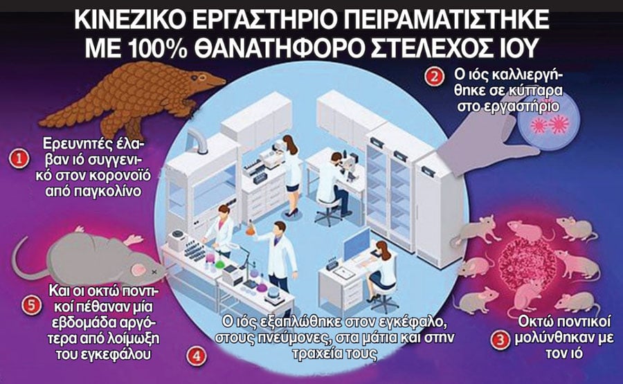 Τρόμο προκαλεί η αποκάλυψη ότι ερευνητές στην Κίνα έκαναν πειράματα σε εργαστήριο στο Πεκίνο με μεταλλαγμένο κορονοϊό, ο οποίος μετέτρεψε ποντικούς σε ζόμπι, με ολόλευκα μάτια και συρρικνωμένο εγκέφαλο, προτού τους ξεπαστρέψει όλους σε χρόνο ρεκόρ. Η μνημειώδης αδιαφορία τους για τον κίνδυνο διαρροής από λάθος του κορονοϊού, με ανυπολόγιστες συνέπειες για την ανθρωπότητα, ξεσήκωσε διακεκριμένους ερευνητές της Δύσης, που κάνουν λόγο ακόμη και για «τρέλα».