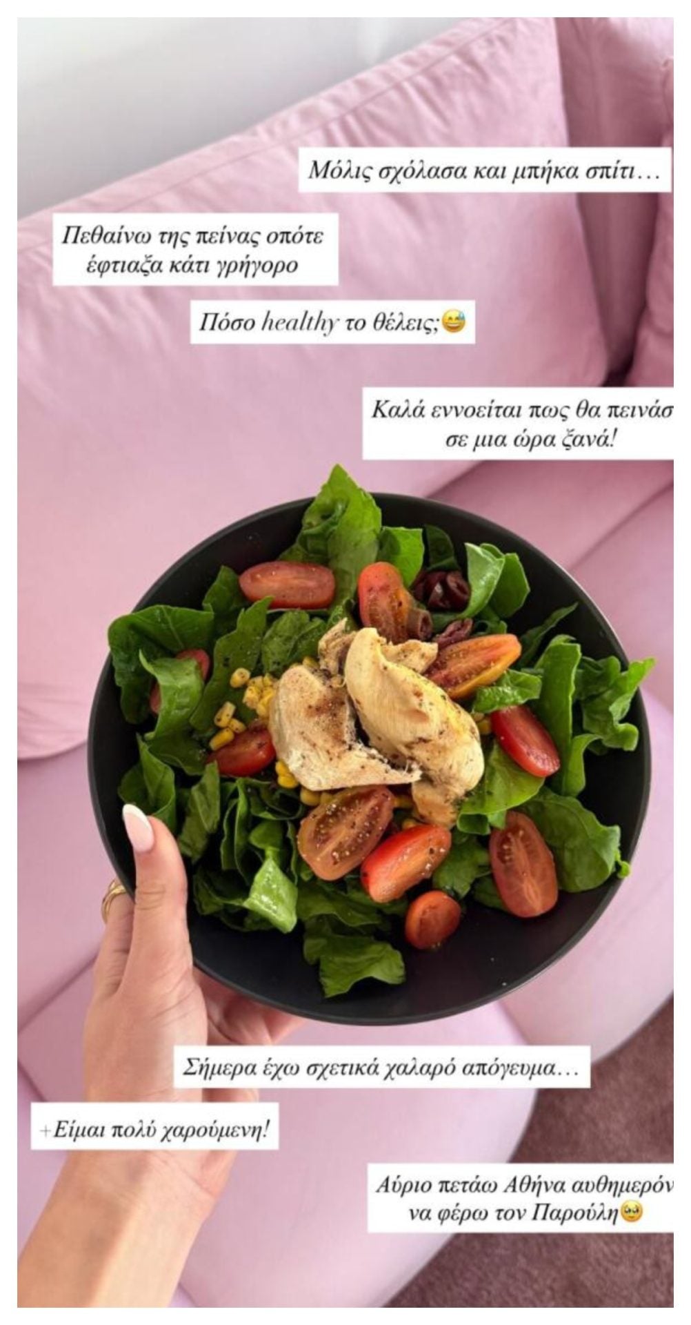 Η influencer δημοσίευσε στον προσωπικό της λογαριασμό στο Instagram, ένα στόρι όπου μας δείχνει το απογευματινό της γεύμα που ετοιμάζεται να απολαύσει. Στο πιάτο που έφτιαξε, πρόσθεσε μαρούλι, κοτόπουλο, καλαμπόκι, ελιές και ντοματίνια, υλικά τα οποία προσφέρουν ποικίλα οφέλη στον οργανισμό μας.